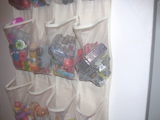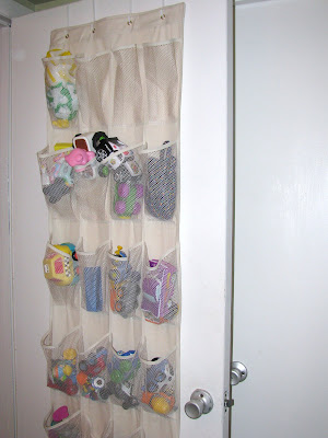 The best way that I’ve found to organize small toys is using an over-the-door shoe organizer. The mesh pouches make the toys easily visible, and while the lower half of the pouches are within kiddos reach, the upper pouches are useful for toys you need to keep away from a younger sibling. We have one in our family room over the guest room door and one in our daughter’s room as well for her stuffed animal menagerie and growing doll collection.