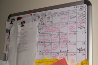 I keep a master paper calendar in a little book to be able to keep track of doctor’s appointments for all four members of my family, social outings from playgroups for toddler to pick-up b-ball for Dad, and writing “to-do”‘s for me, just to name a few items. But nothing has been better for helping my husband and I both make the family’s agenda a top priority than our erasable white board calendar. Every month we simply erase and start again, and with it’s kitchen wall location, we never forget to check the calendar to see what is coming up in the week ahead. By removing our work obligations, we’ve cut down on visual clutter……somewhat. Those kids sure do an awful lot for pre–schoolers!