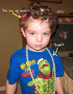 Last week Noah was supposed to start pre-school. He went one day and then he got sick. And I was sick. And Emma still went to kindergarten every day, leaving us trapped in the house, bored…He chose the pearls. 🙂